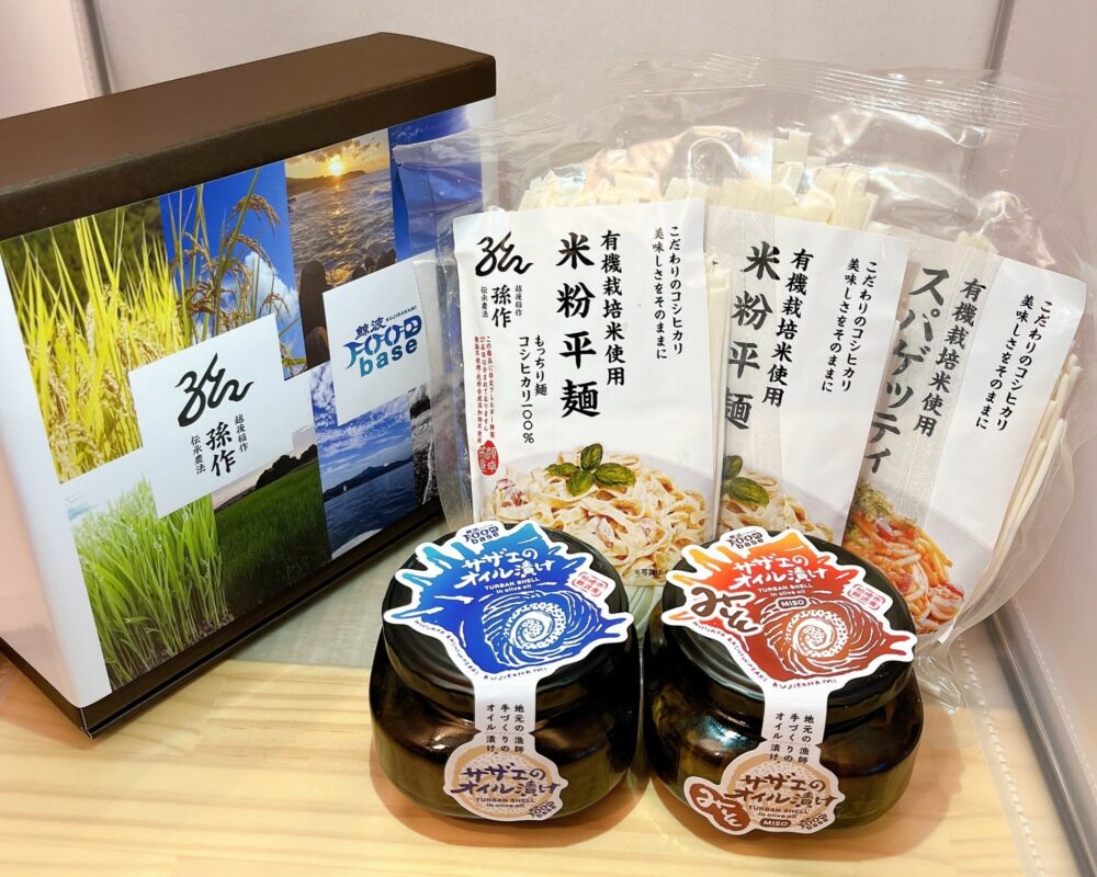 柏崎の「サザエのオイル漬け」2種と、刈羽の「孫作の米粉麺」がコラボした特別セットです。